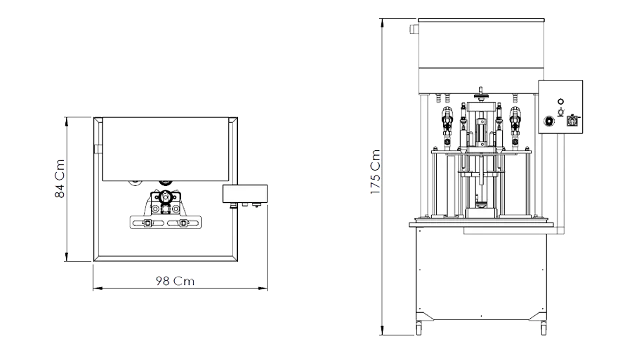 Manuel dolum makinesi. Muhtelif şekillerdeki teneke, kutu, pvc, cam, şişe ve benzer ambalajlara, Elektro pnömatik sistemle hassas gramaj ayarlı dozaj pompaları vasıtasıyla hacimsel olarak dolum yapar.